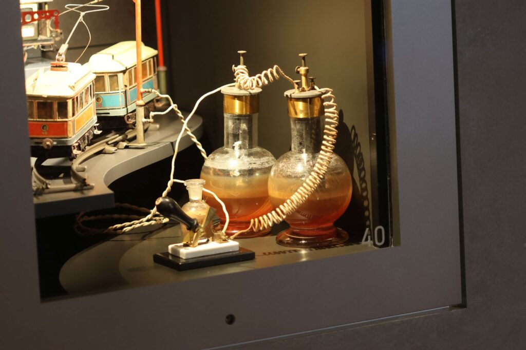 „Elektrische Bahn mit Oberleitung“ – Auszug aus der Gebrauchsanleitung: „Von dem beigegebenen roten Pulver, welches aus präpariertem doppelchromsaurem Kali besteht, wird in jedes Element ca. 25 Gramm hineingegeben und wird das Element mit etwas über drei Viertel des Inhaltes mit lauwarmem Wasser gefüllt … Dann wird die Kohle des einen Elements mit dem Zink des anderen Elements verbunden, alsdann wird die freie Kohlenklemme des einen Elementes mit der Polklemme auf der Schiene und die andere freie Zinkklemme des anderen Elementes mit der zweiten Klemme der Schienen durch isolierte Kupferleitungsdrähte fest verbunden. Bei Flaschenelementen ist zu beachten, dass nach einigem Gebrauch sich die mittlere Stange durch die Säure oxydiert und oft dadurch der Strom unterbrochen wird …“