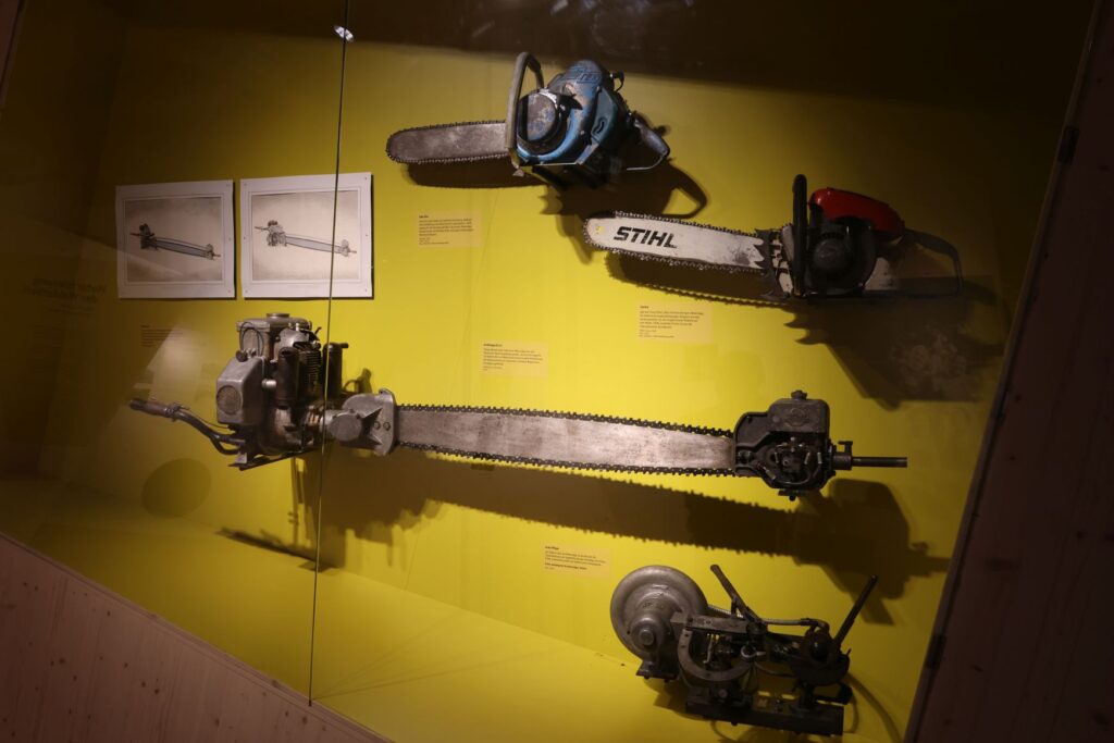 Der zweite Ausstellungsbereich beschäftigte sich mit den technischen Neuerungen der Forstwirtschaft im 20. Jahrhundert. Mein Schwiegervater hat selbst Geschichten parat, die davon erzählen, wie die Zweihandsäge quasi über Nacht von der Stihl-Zweihand-Motorsäge ersetzt wurde und wie rasant sich dadurch das Wesen der Holzernte veränderte.