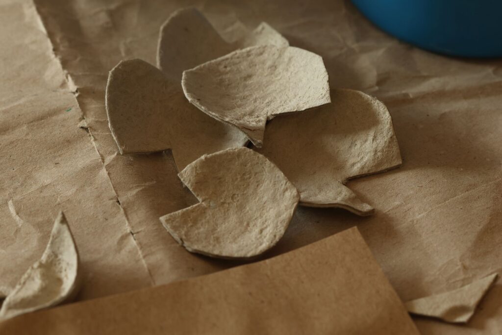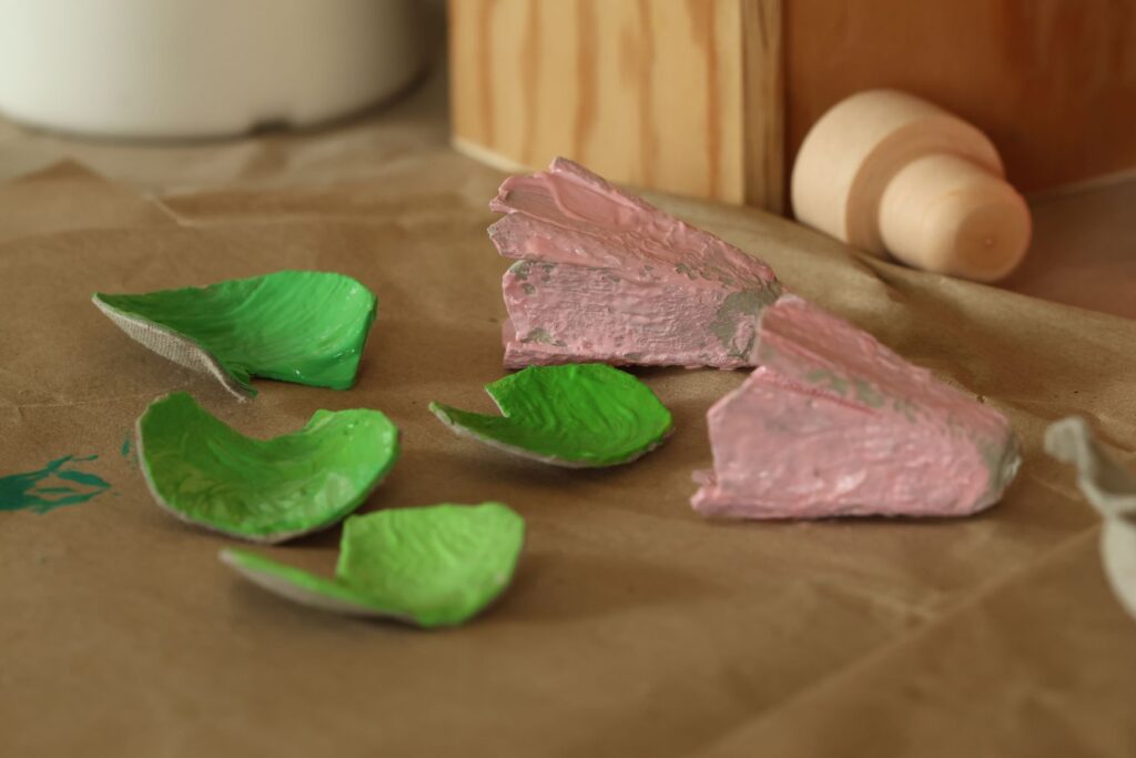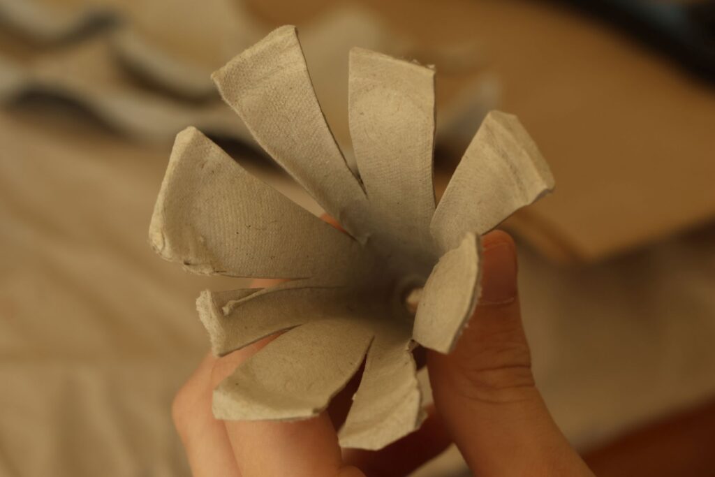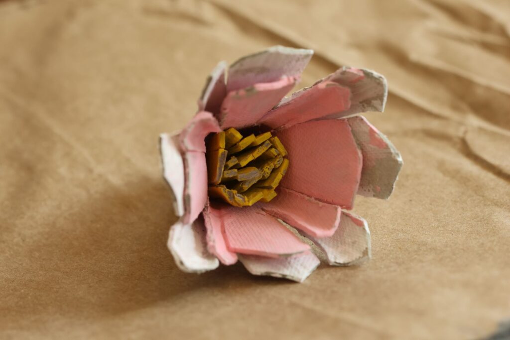 Wenn unser kleiner Mann mit einem älteren Geschwisterkind oder anderen Kindern gemeinsam malt oder bastelt, wächst sein Anspruch an sich selbst. Man sieht seinem kleinen Gesichtchen den Eifer, mit dem er es anderen gleichtun will, regelrecht an. Vollkommen unterschiedlich ist es, wenn er ganz allein und in seine kleine Welt versunken ist und es keine Mitstreiter gibt. Das Vorbild anderer löst einen ungeahnten Ehrgeiz in ihm aus, gleichzeitig ist er rascher unzufrieden mit seinen Ergebnissen. Komisch. Irgendwie habe ich ein Déja-vu. War das nicht auch schon bei Linus so, wenn er mit seiner älteren Schwester gemeinsam den Pinsel schwang? Jedenfalls war ich gut beraten, Merlin (5) zu fragen, ob er Hilfe beim Ausschneiden der Blütenteile aus Eierkarton benötigte. Er bejahte. Linus (11) hingegen benötigte an dieser Stelle keine Hilfe mehr und schnippelte Blüten und Schwimmblätter frei Schnauze und ohne fremde Unterstützung.