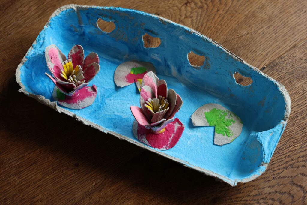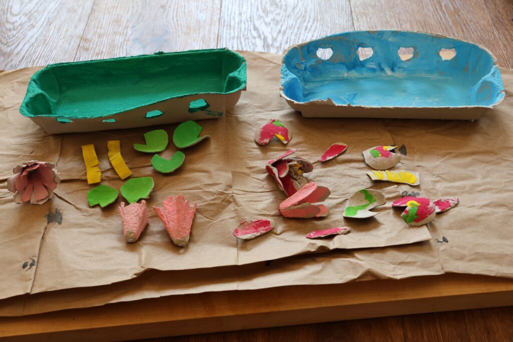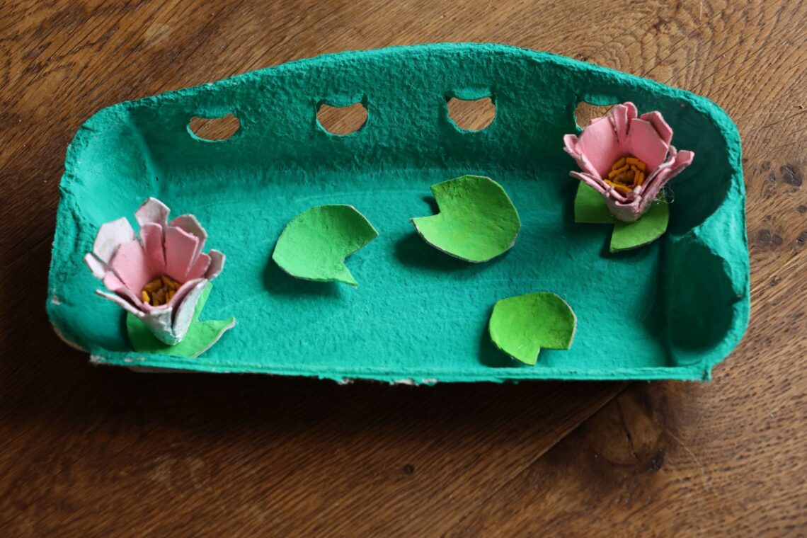 Schon Anfang Mai beschlossen Linus (11) und ich, diesen schönen Anblick (der Seerosen; nicht der „Rumpfnasen“) zu konservieren und kleine Seerosenteiche aus Eierkartons zu basteln. Und selbstverständlich wollte auch der kleine Bruder mitbasteln.