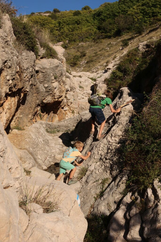 Meine Kamera musste wieder in den Rucksack wandern. Im weiteren Wegeverlauf musste man zweifellos freie Hände haben, um die teilweise drei bis fünf Meter hohen Kletterpassagen gut meistern zu können. Hie und da gab es Steighilfen, zum größten Teil musste man sich aber selbst auf die Suche nach geeigneten Griffen und Tritten begeben. Da die immer schroffer werdenden Wände der Schlucht nur wenig Tageslicht zum Boden ließen und wir nicht einschätzen konnten, wie viel Zeit die Kletterei noch in Anspruch nehmen würde, hielten wir die Kinder dazu an, zügig zu gehen. Ihren Spaß hatten die Jungs trotzdem oder vielleicht genau deshalb. Wie die Steinböcke kraxelten sie behende aufwärts.